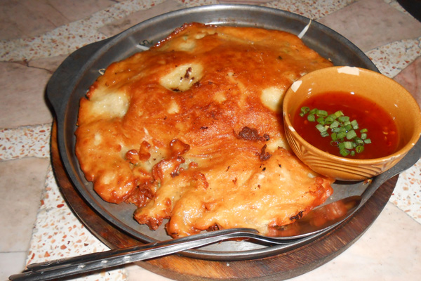 Nagyjából három merőkanál olajat öntenek a serpenyőbe, mielőtt beleöntenék a tojásos, húsos, zöldséges keveréket, ami a forró olajban azonnal lángos-alakot ölt. Ettől aztán cseppet sem tűnik egészségesnek, de kompenzálásnak ott van alatta a babcsíra. És persze e mellé is jár a sweetchili. Mivel nem csak a kaját sütik meg, hanem a tálat is, amiben adják, egy darabig csak nézni érdemes, de lassan kihűl. Képzelj el egy lángos állagú tojásos ételt. Pont olyan.